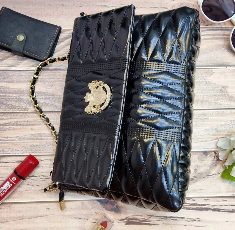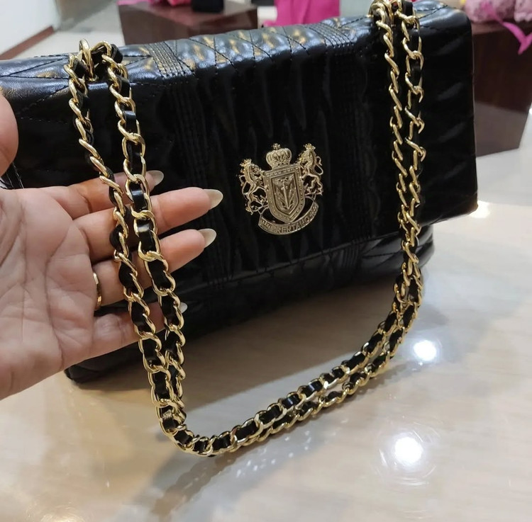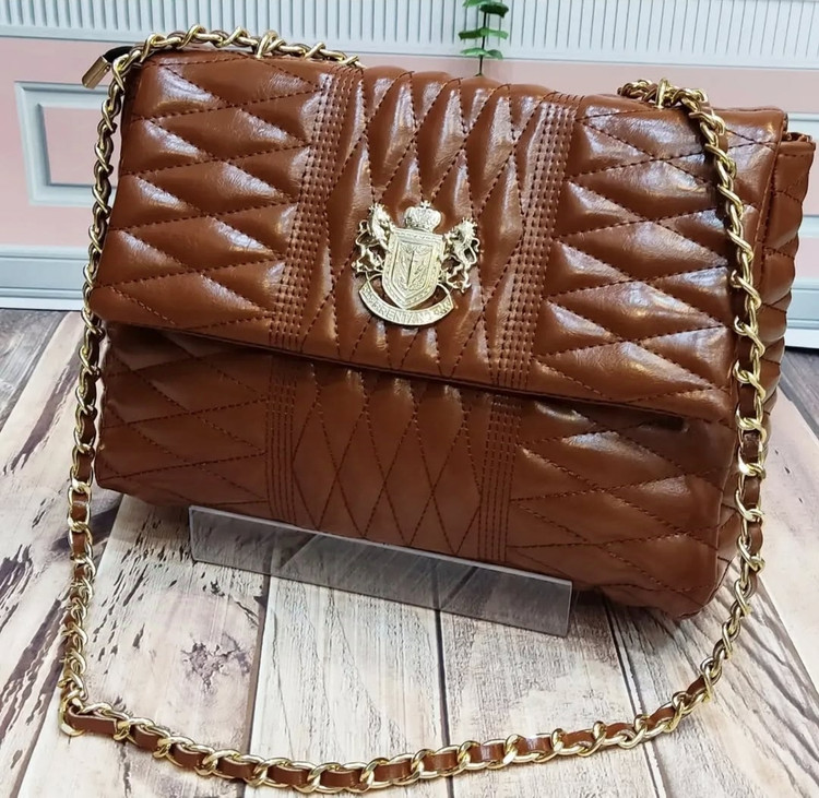 کیف زنانه _با آرم شیر و خورشید _چرم مصنوعی براق _جیب زیپ دار بزرگ _جیب زیپدار کوچک_ بند ترکیبی زنجیری و چرم_ دو رنگ مشکی و قهوهای