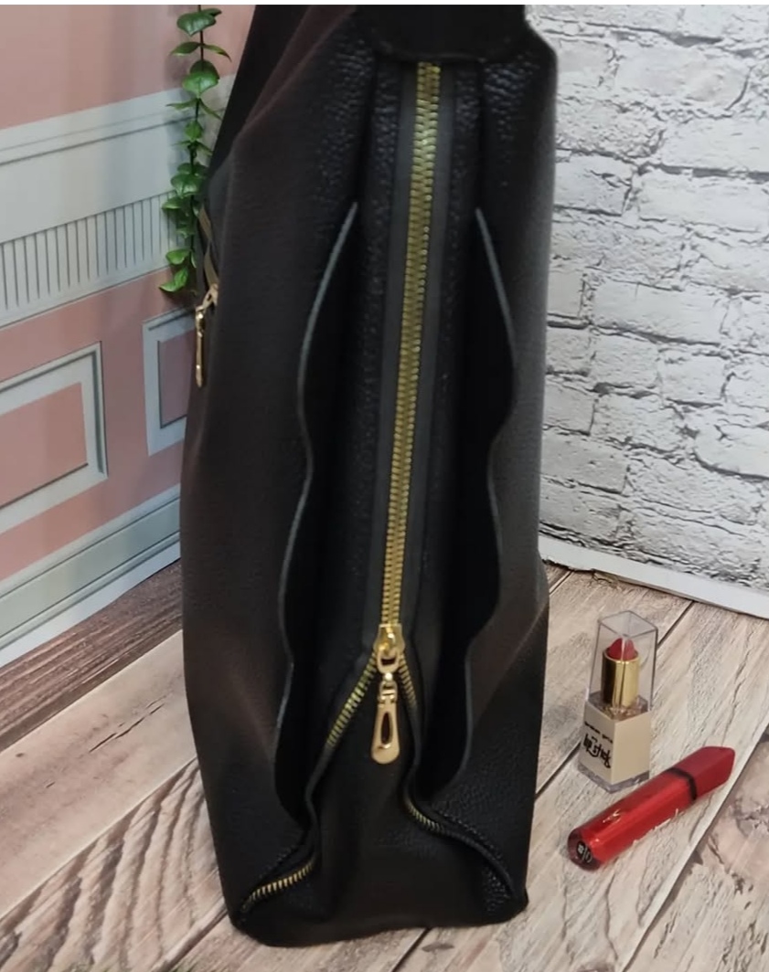 کیف زنانه بزرگ جنس چرم شرانگ، رنگ مشکی، بند قابل تنظیم، زیپ کوچک درقسمت پشت، زیپ بزرگ جادار، دو زیپ دردو طرف کیف به عنوان تزیین، برند فلامینگو با آستر با مارک فلامینگو ابعاد کار36/36/12