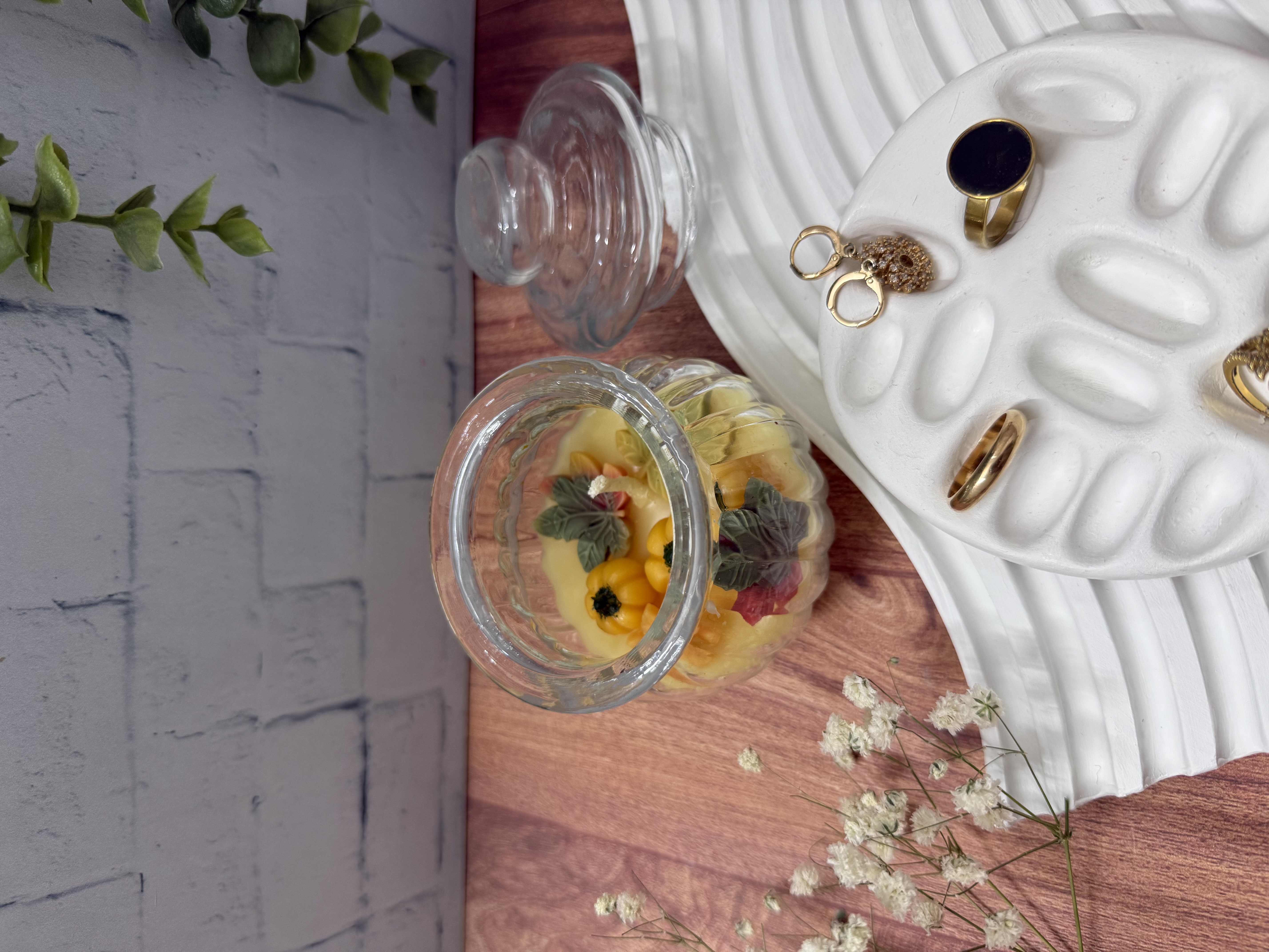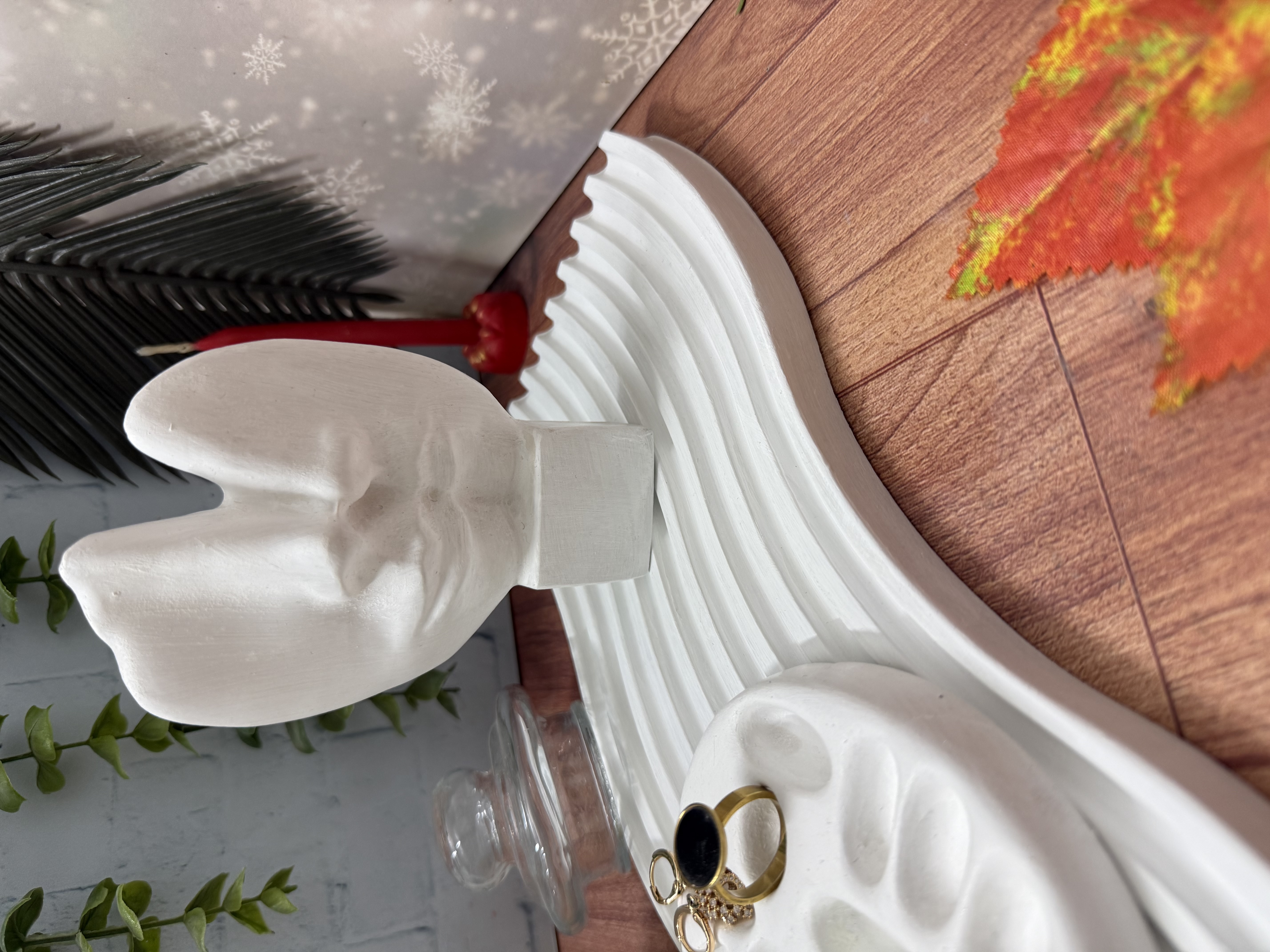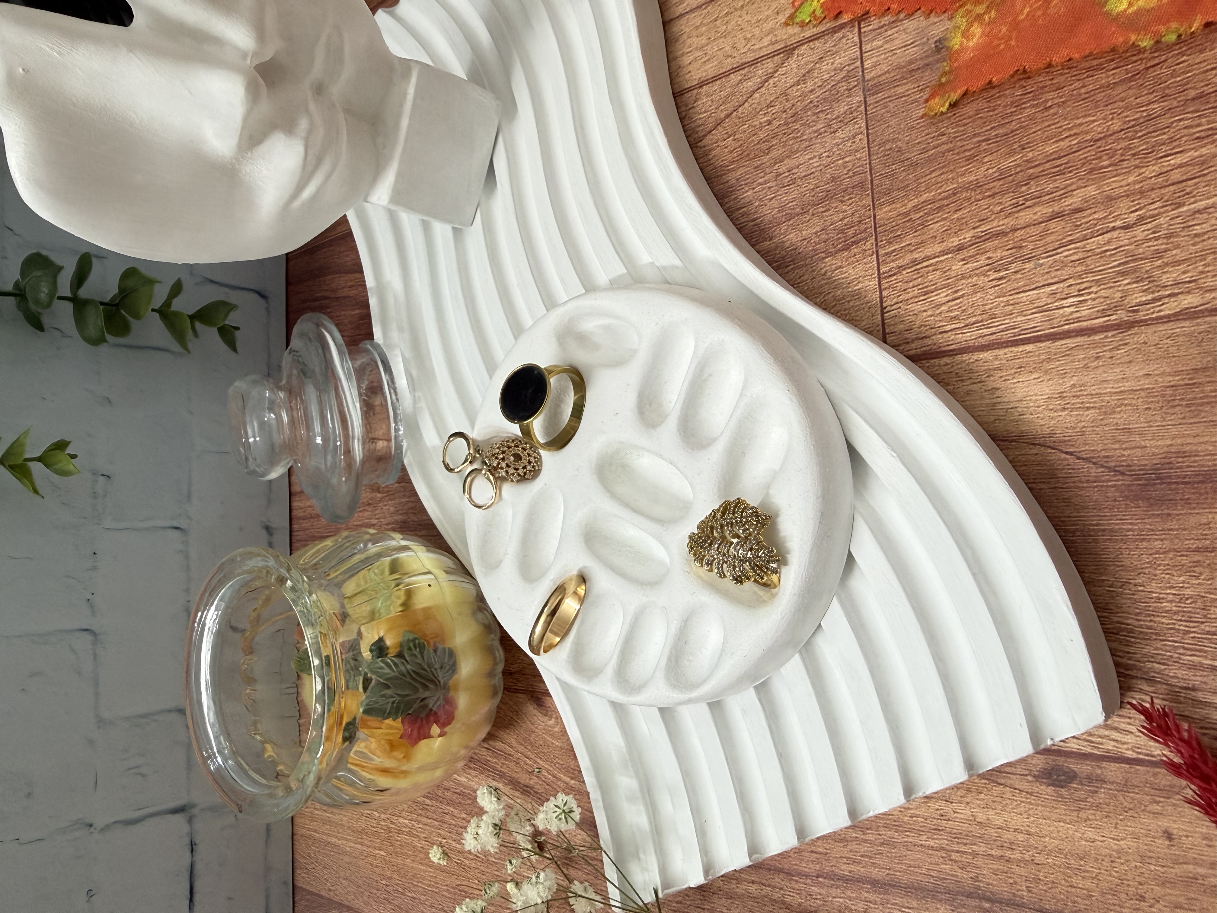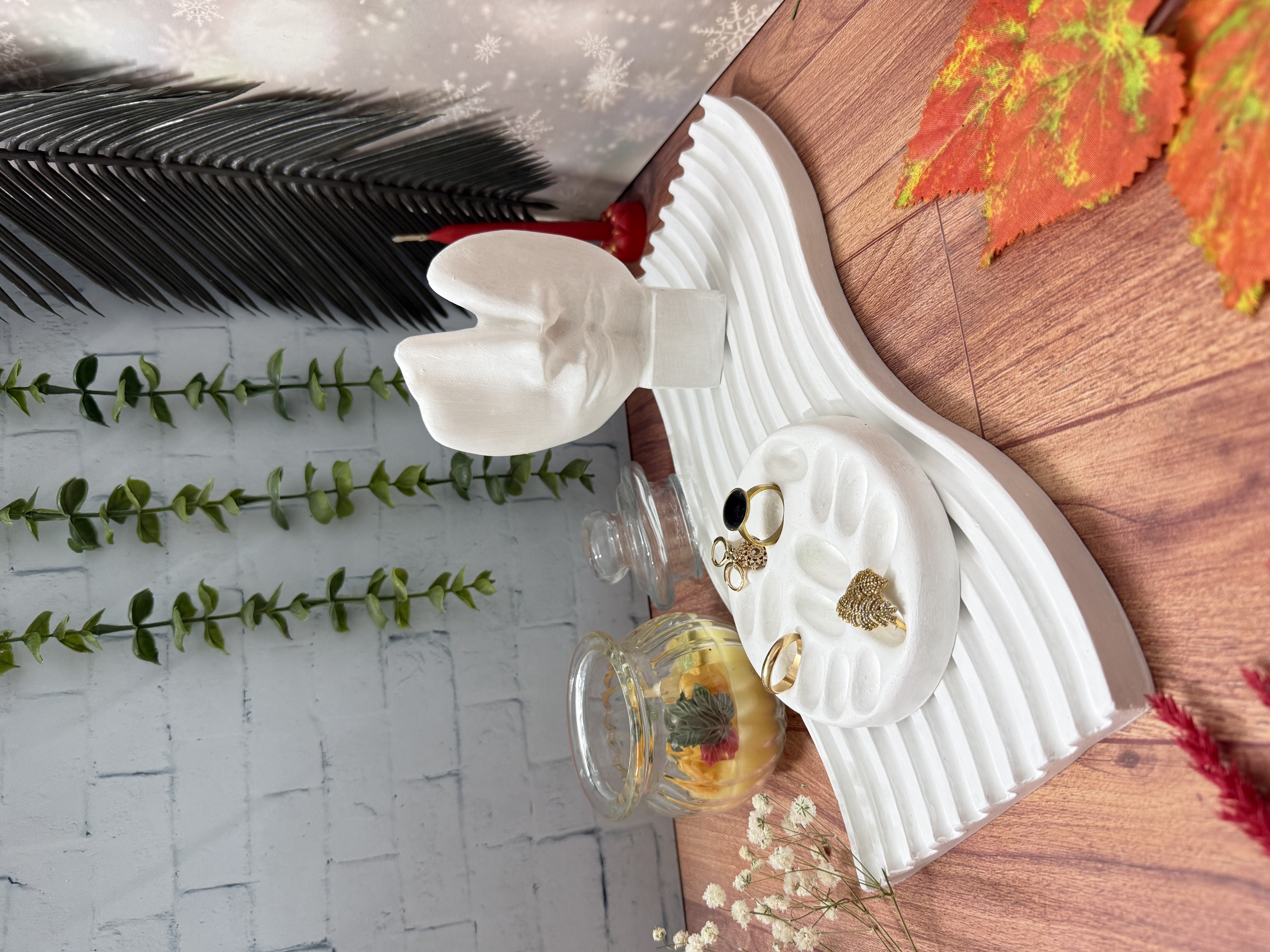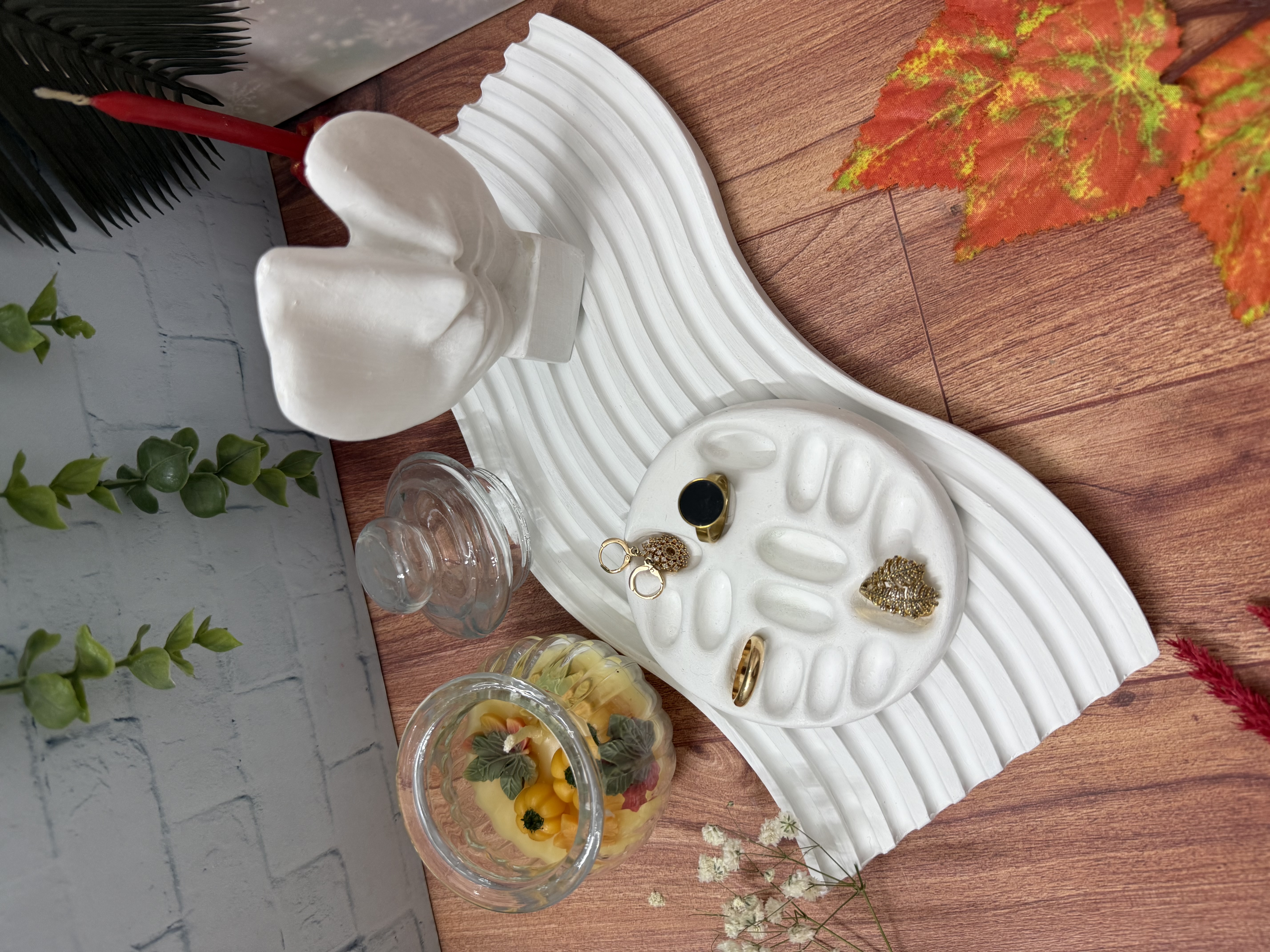دکوری زیبا مناسب میز ارایش عروس شامل شات شمع پاییزی، استند موج، تندیس رخ و جای انگشتر